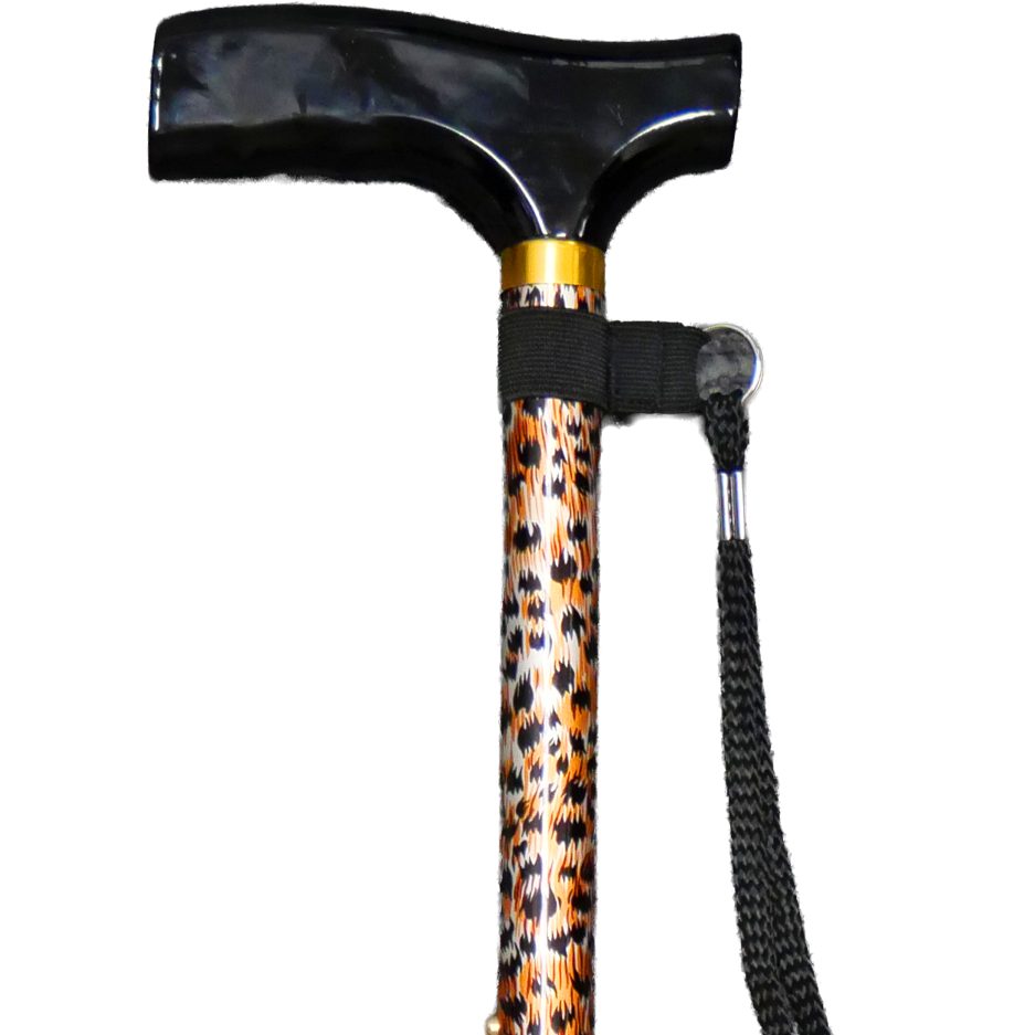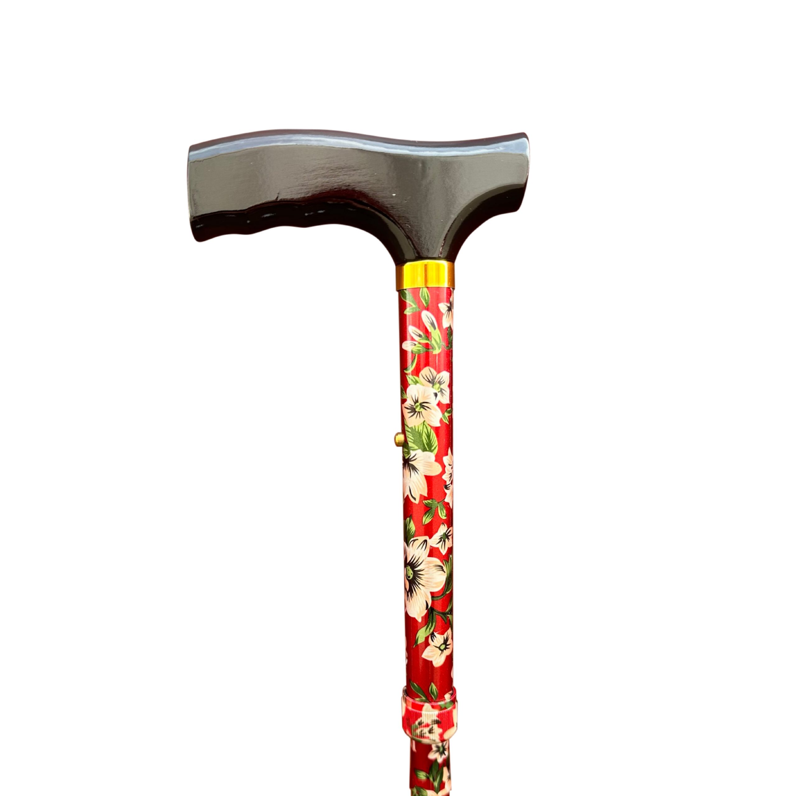 This height-adjustable walking stick has an ergonomic wooden T-shaped handle and a non-slip rubber tip/ferrule. It is conveniently designed to fold down small enough to fit into small spaces such as handbags, backpacks, and more.