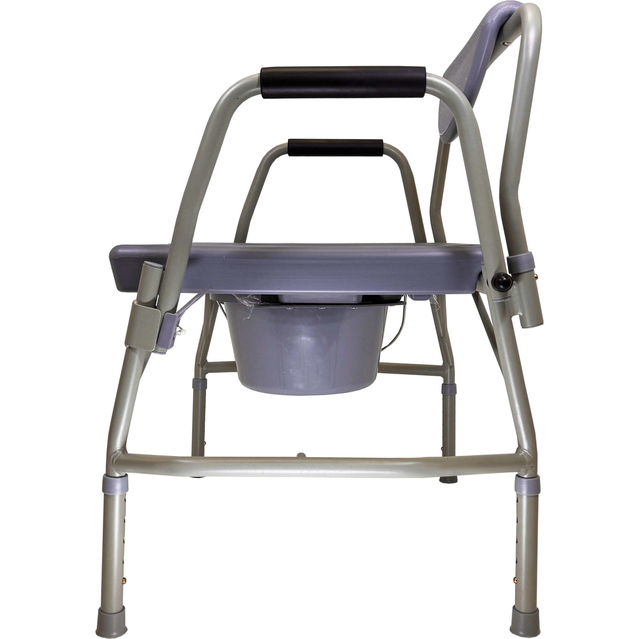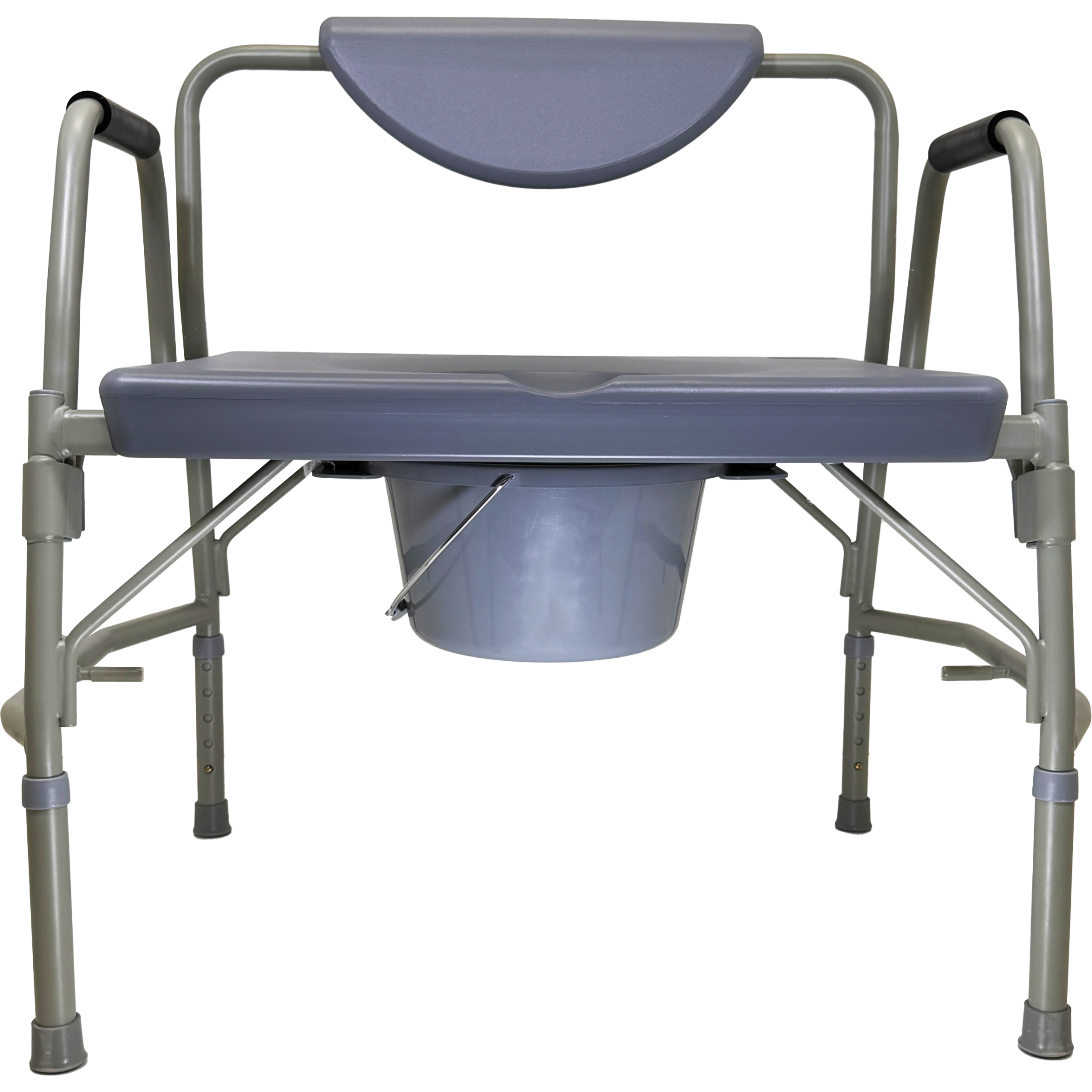 The Heavy Duty Commode is tailored to cater to individuals needing extra width, featuring a heavy-duty steel frame with drop-down arms and height-adjustable legs. These robust features ensure functionality, safety, and security, meeting diverse user needs effectively.