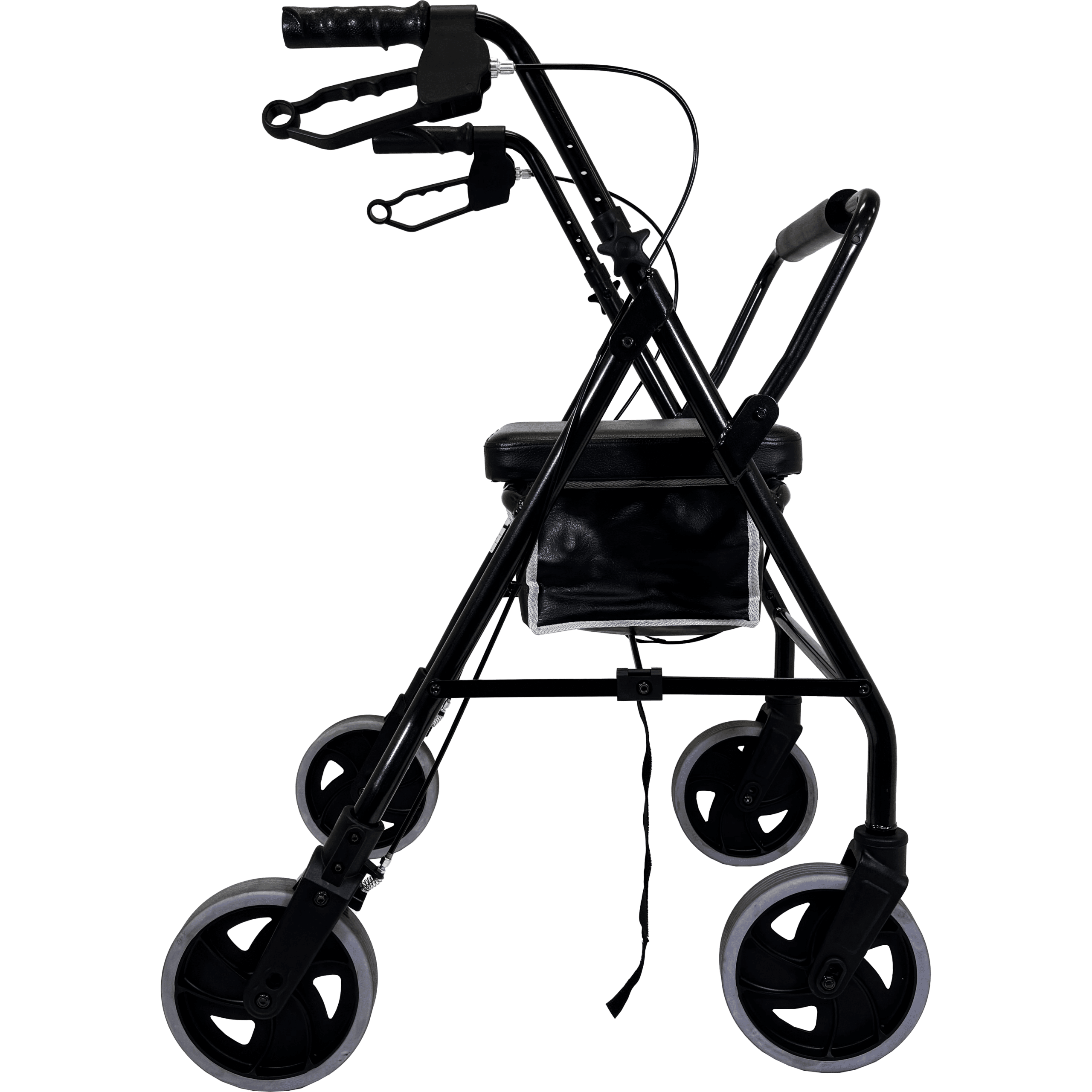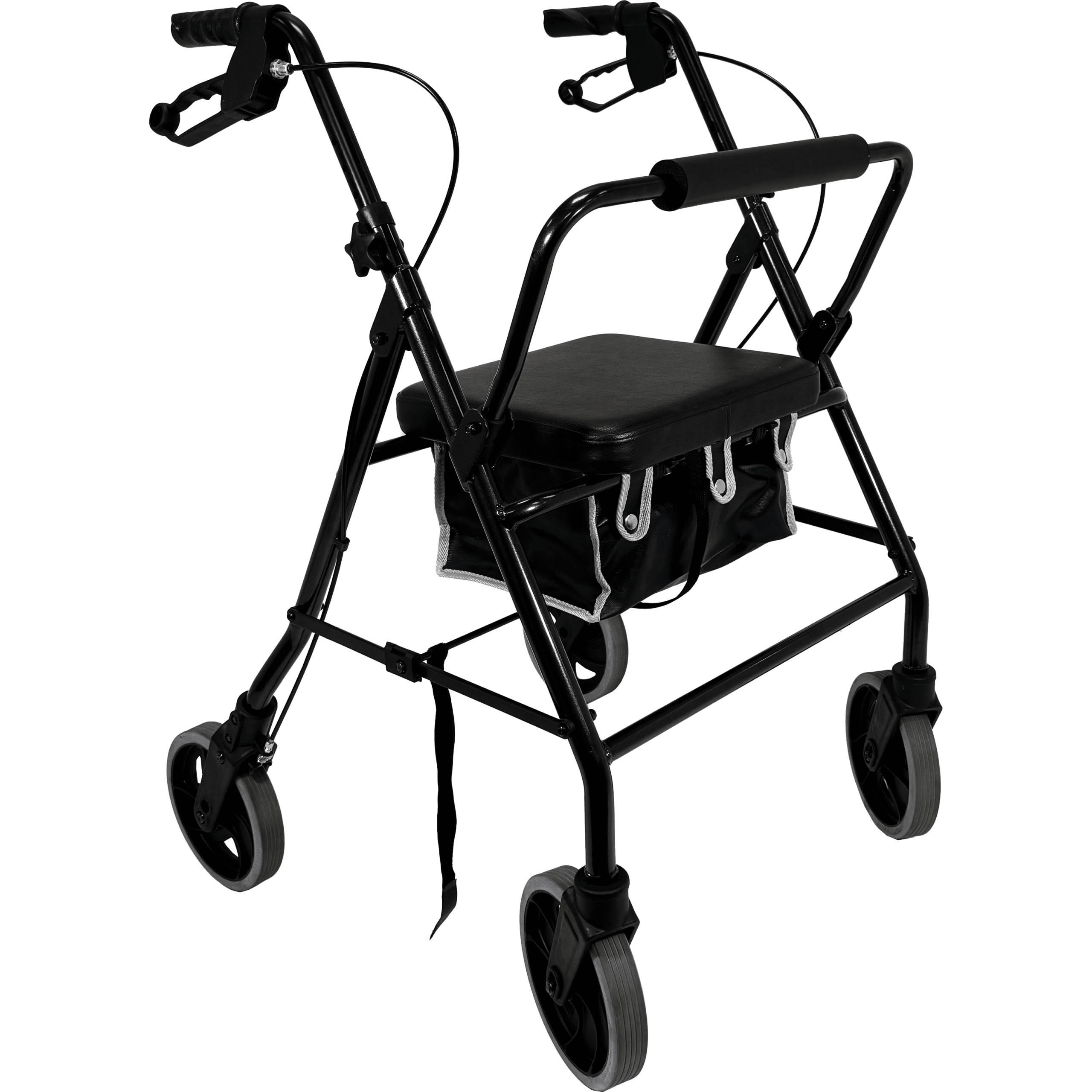 The seat, designed for comfort with a solid base and padded cushion, folds up to reveal a removable nylon carry bag, which can be replaced with an optional wire basket. For easy storage and transportation, simply pull the centre rod vertically under the seat to fold the rollator. Additional features include a padded back bar, ergonomic height-adjustable rubber handles, and handle-mounted brakes that can be locked into position. Available in any colour—as long as it’s black!