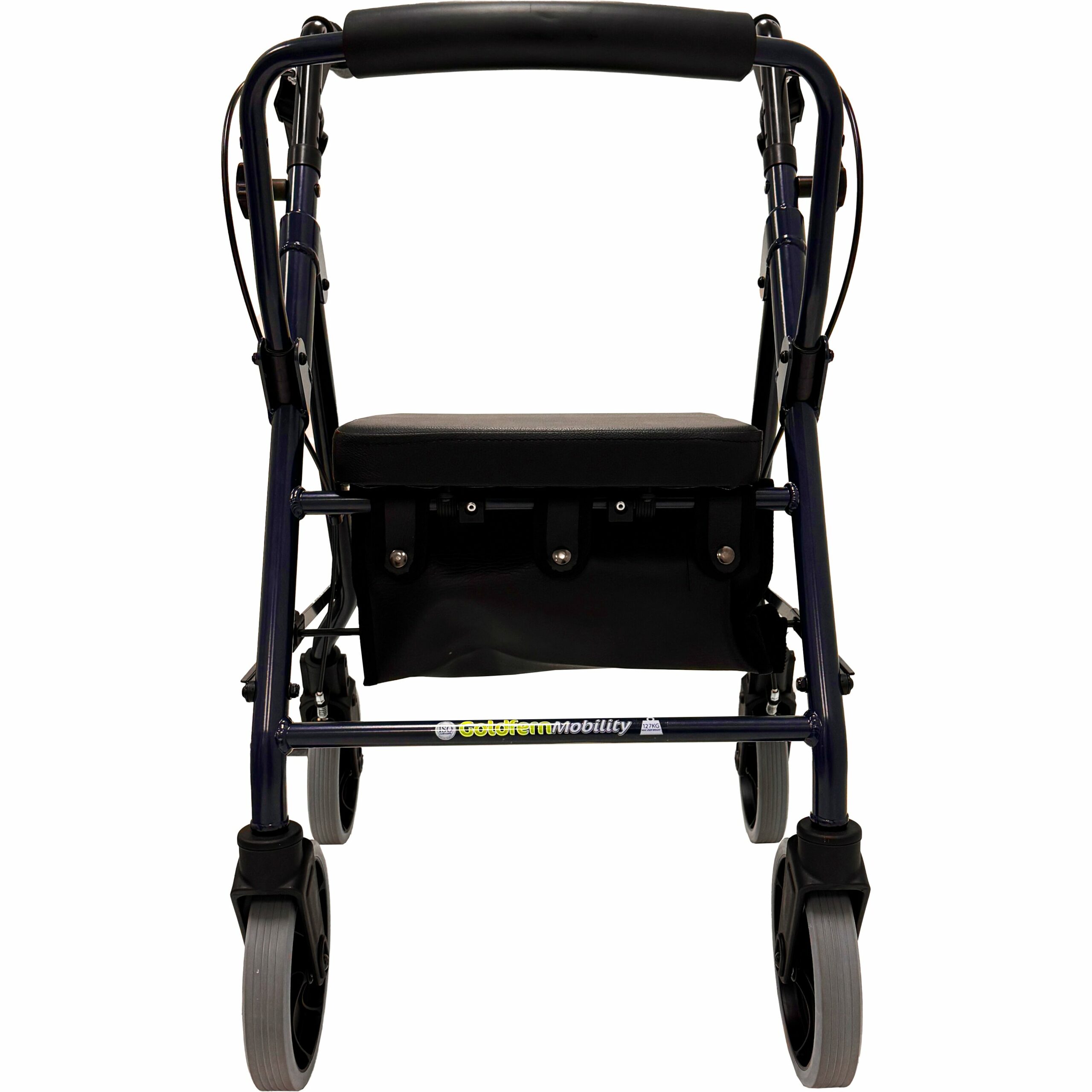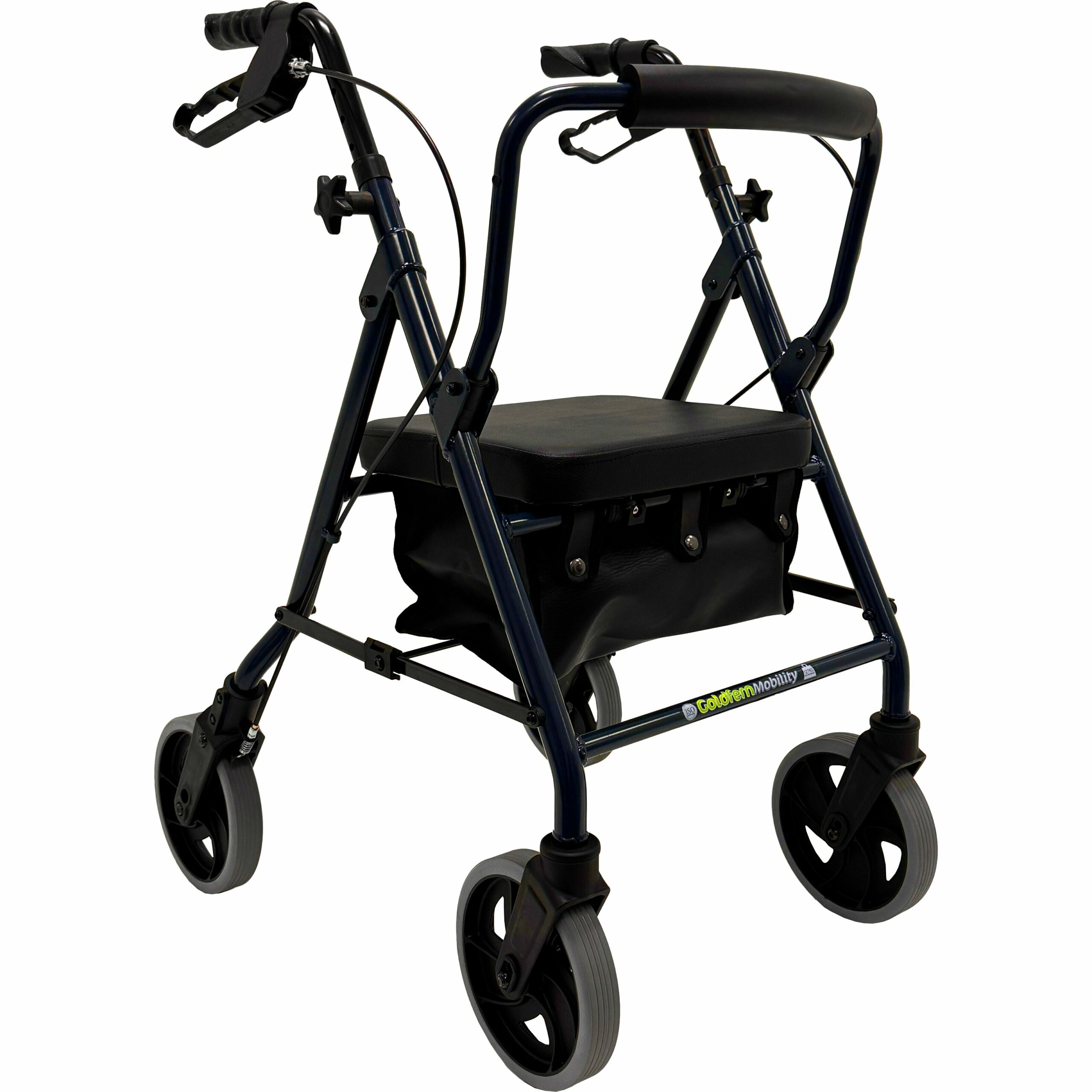 The Narrow Premium Rollator is one of very few ISO-approved narrow rollators in New Zealand, now offered nationwide through our network of stockists. This model is constructed with lightweight aluminium in a dark navy colour, featuring a fully-foldable functionality for convenient transport and storage. The seat with a built-in cushion provides a safe and comfortable place to sit. The seat also folds up to reveal a removable under-seat nylon carry bag, optionally replaceable with a wire storage basket.